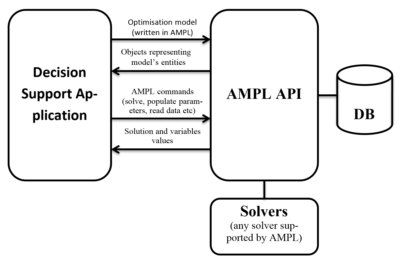 The intended user of the library is the developer who needs to connect an application to optimization models and solvers, or the analyst with some experience in programming who wants to build a quick proof-of-concept application. Architecture schema of AMPLAPI below shows a possible architecture and a sequence of interaction between a decision support system relying on an existing IT framework and AMPL API.